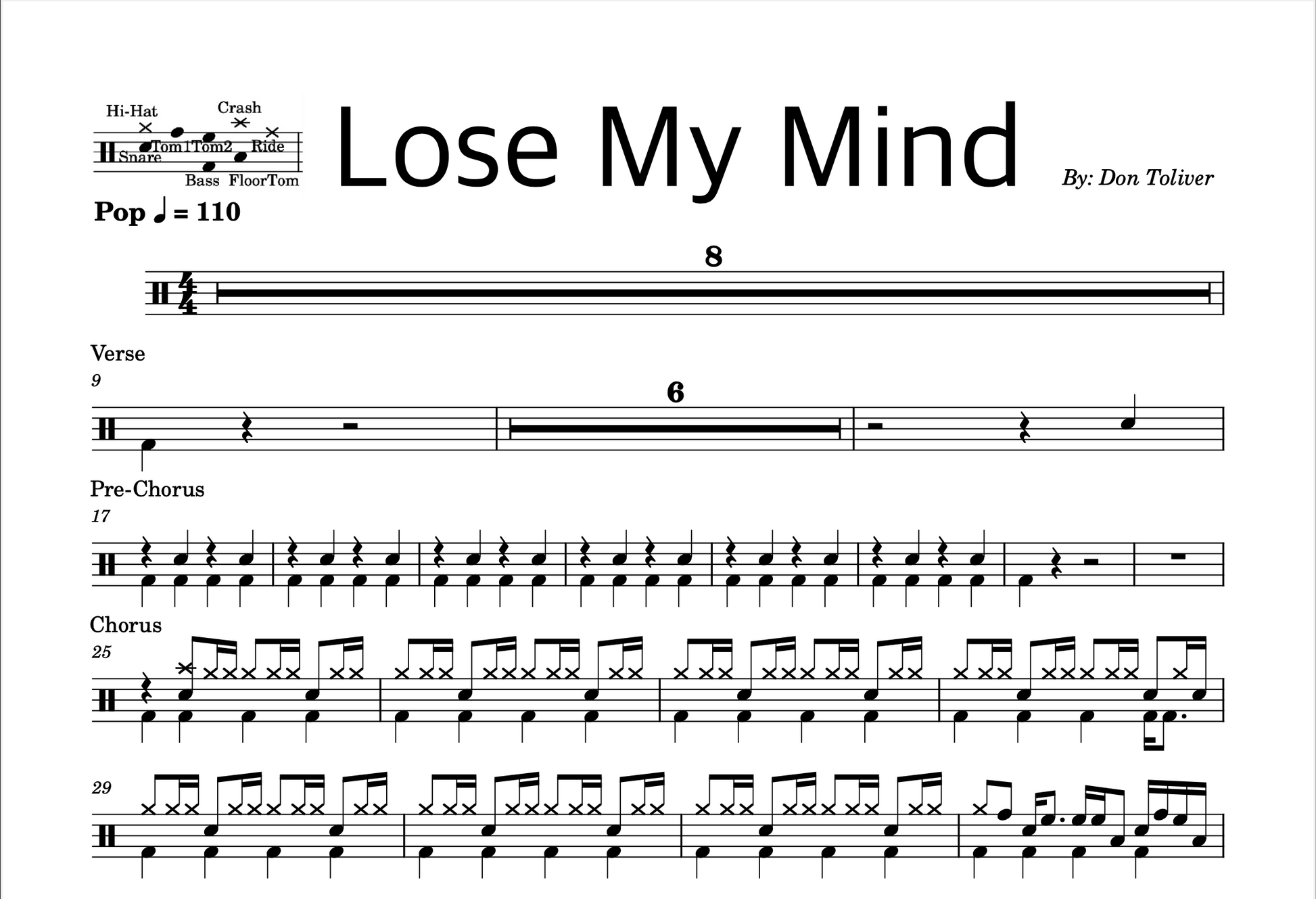 Beginner level sheet music of "Lose My Mind" by Don Toliver for the drums.